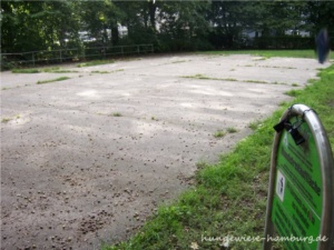 Wo bin ich denn hier gelandet? Eine Betonfläche mit etwas Rasen am Rand. Ich schaue Herrchen an und er schaut noch mal genau hin. Ja, das hier ist eine „Hundewiese“. Ein großes Schild verkündet es. Nach dem Schild zu urteilen ist es hier aber wichtiger, unsere Hinterlassenschaften zu entsorgen als hier Spaß zu haben. Wir treffen zwei andere Hunde die beide auch nicht gerade begeistert sind. Beton und Asphalt haben wir schon an den Straßen, auf den Hundewiesen möchten wir doch Rasen haben. Hier geht es schließlich auch um unsere Gelenke. Zumindest ist die „Wiese“ eingezäunt und somit vom viel befahrenen Eidelstedter Weg abgegrenzt. Es ist hier aber immer noch ziemlich laut. Also wohl fühle ich mich hier nicht, ich will hier weg und auf eine richtige Hundewiese. Parkbänke und Mülleimer sind vorhanden.